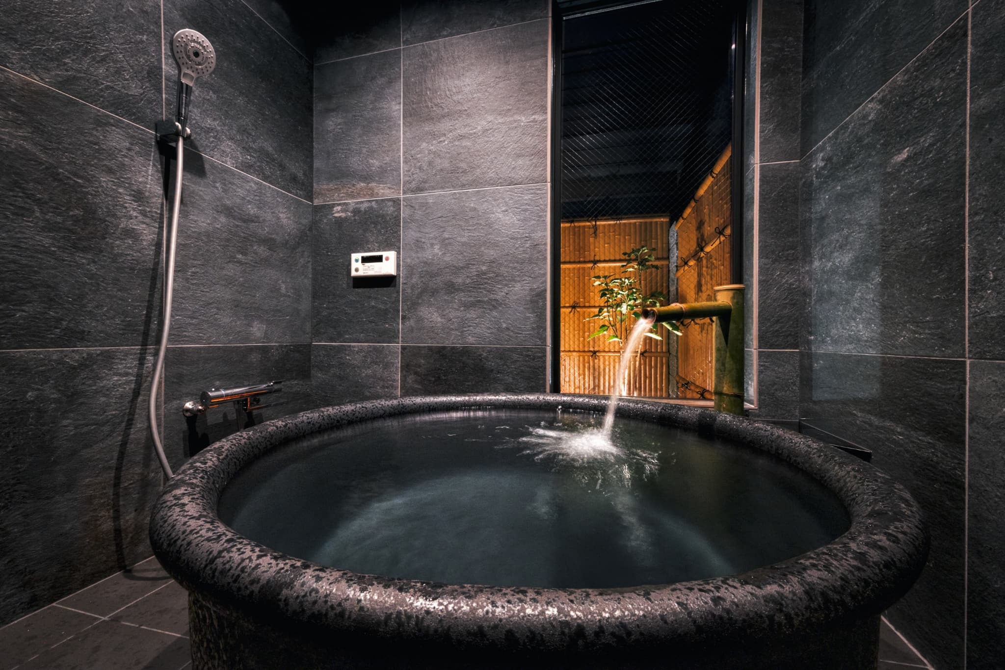 土の質感を感じる信楽焼の浴槽は京町家の空間と美しく調和し、滞在のひとときをより豊かに演出します。
