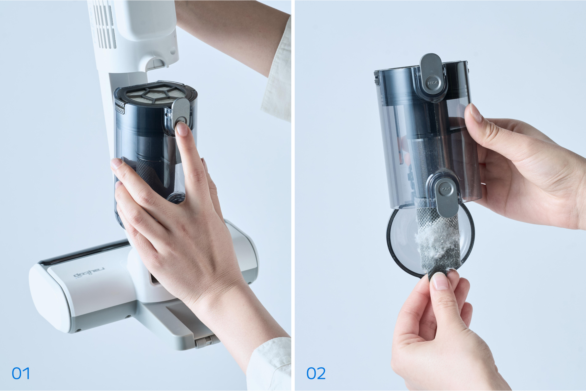 ワンタッチでゴミ捨て可能なダストボックスと使い捨てフィルターを採用し、手を汚さずゴミ捨てが可能になりました。