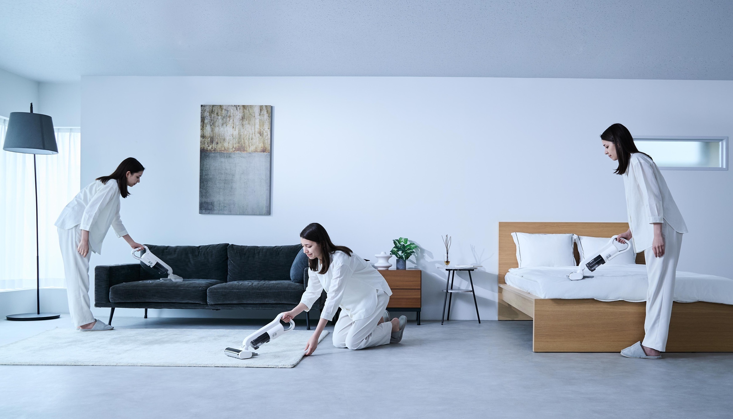 収納も掃除もコンパクトでさらに使いやすくなりました。自立型デザインだから、お部屋のどこでもすっきり収納することができ、掃除したいときにパッと持ち上げて、掃除途中でもスッと置くことができます。