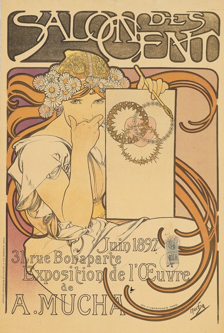 主催する美術ギャラリー「サロン・デ・サン」での展示が開催されています。この時代、 ロートレックもミュシャも、様々なオファーにより石版画を制作、また多くの展覧会に出品するばかりでなく個展も開催するなど旺盛な活動を展開していきました。