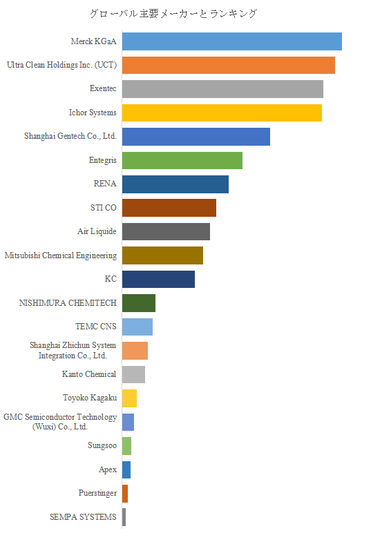 LP Informationのトップ企業研究センターによれば、薬液供給システムの世界的主要製造業者にはMerck KGaA、Ultra Clean Holdings Inc.(UCT)、Exentec、Ichor Systems、Shanghai Gentech Co., Ltd.、Entegris、RENA、STI CO、Air Liquide、Mitsubishi Chemical Engineering等が含まれる。2025年時点でトップ5企業は売上観点から約57.0%の市場シェアを持ち、トップ10企業は約80.0%の市場シェアを持つとされる。これは、当該領域が“設計・製造・品質保証・現地立上げ”までを要求するシステム財であり、顧客側の工程リスク許容度が低いことから、実績と供給能力を備えた企業へ集約しやすい構造を示す。上位企業の顔ぶれが素材・ガス・装置周辺の領域にまたがる点も、薬液供給が単独製品ではなく、プロセスインフラとしての統合提案力を競う市場であることを裏付ける。