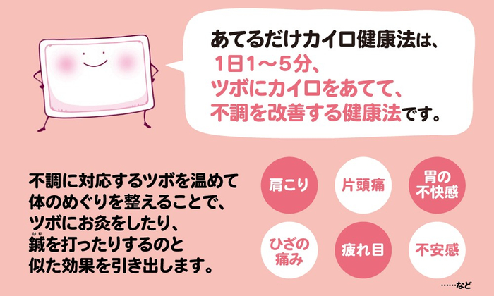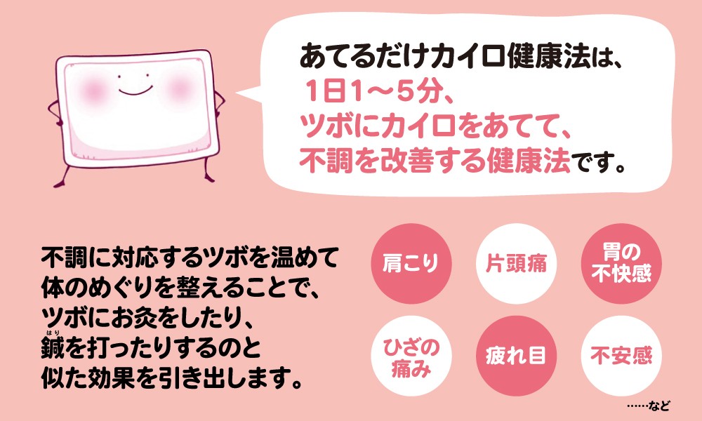 「カイロ健康法」とは、ツボにカイロをあてて温めるだけの、いわば火を使わない“お灸” 。 体の巡りを整え、毎日のつらさを和らげてくれる、カンタンで安全なセルフケア法です。