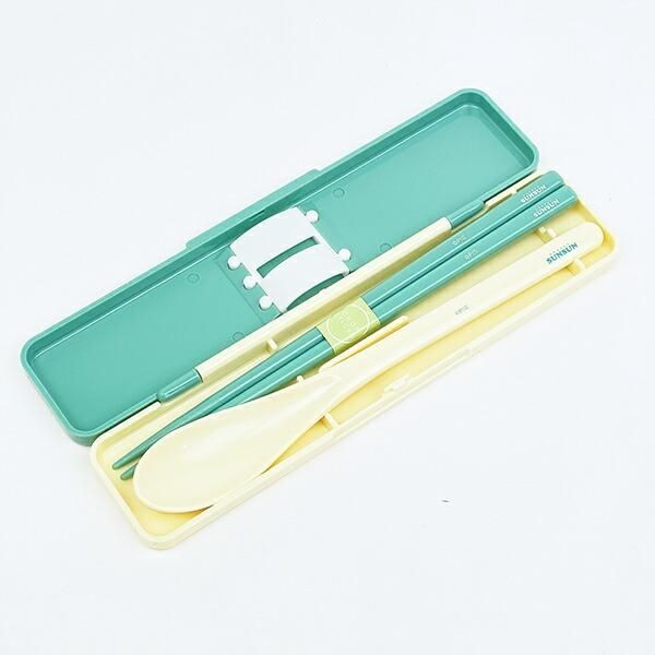 お弁当を持って行っているとカチャカチャと音がなるのが恥ずかしかったりするのんですがこちらは、シリコンクッションが付いているので、音が鳴りにくい仕組みになっております。食洗機使用可◎【箸・スプーンサイズ:18cm】サイズ:18.8cm×4.7cm×1.8cm 素材:フタ:AS樹脂(100度)、本体・スプーン:ABS樹脂(100度)、箸:メタクリル樹脂(100度)、クッション:シリコーンゴム(140度)