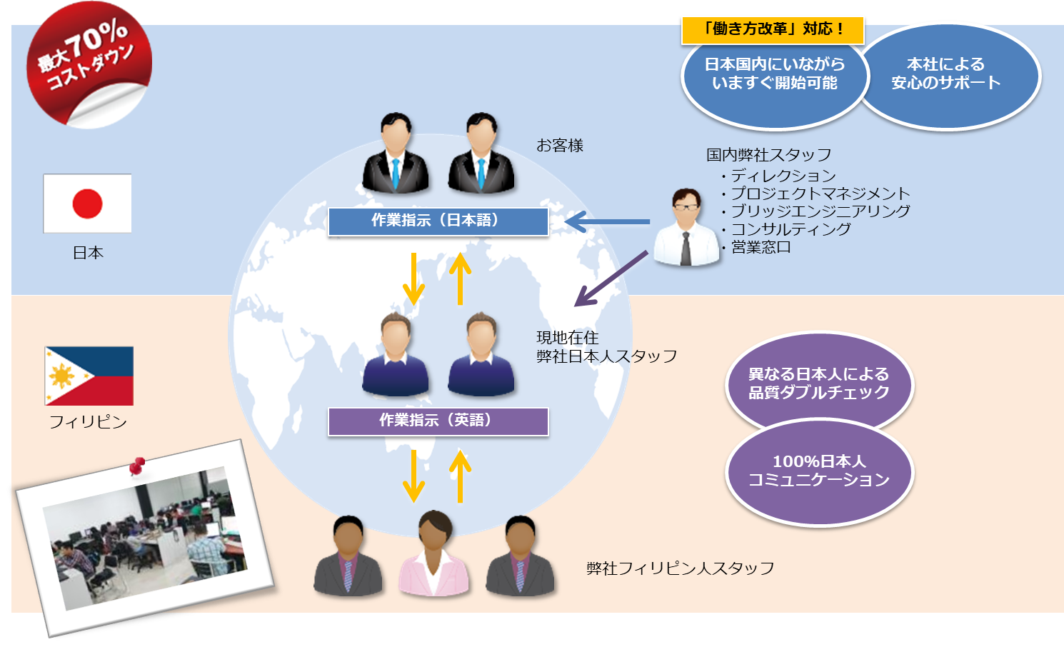 AI向け学習データ作成「セブハイスペックアノテーション」を中心に、オフショア開発や英語サポートを、フィリピン・セブ島に有する自社拠点にて、日本人窓口で高品質かつリーズナブルにご提供します。