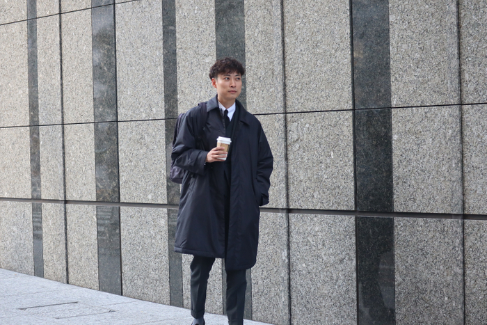 一般的にダウンコートは高い保温性が魅力である一方、ビジネスシーンではボリューム感があるためカジュアルな印象になりやすく、持ち運びや外出先での置き場に困るアイテムでもあります。そこで、今回のコートには、冷えを感じやすい背中部分に老舗羽毛専業メーカー河田フェザー社の「KAWADA DOWN」を使用。その他の部分に、吸湿発熱中綿「HEATES」を採用することで、保温性を確保しながらモコモコ感を抑えた、ビジネススタイルと好相性のステンカラーコートを企画しました。河田フェザー社は、国内外から良質の原料を仕入れ、独自の磨き洗い技術によりふっくらと軽く、保温性の高い高品質ダウンを提供し高い評価を得ています。また、「HEATES」は、体から発散される水蒸気を繊維が吸収し発熱する保温性に加え、消臭機能と制電性も兼ね備えた高機能中綿です。