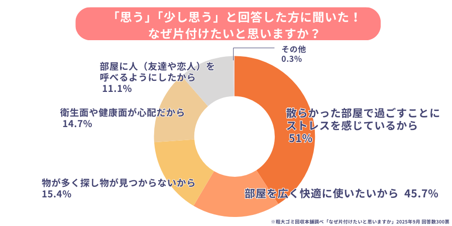 片付けたいと回答した人にその理由を聞くと、最も多かったのは「散らかった部屋で過ごすことにストレスを感じているから」(51%)でした。