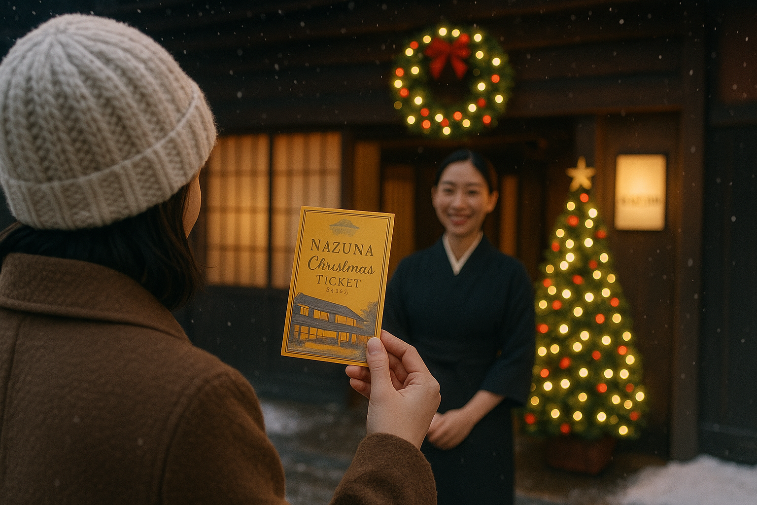 Nazuna宿泊者は、京都・箱根の協賛店舗を訪れることで、各施設ごとに異なるデザインの特別チケットを提示いただくと、小さなクリスマスギフトを受け取れます。