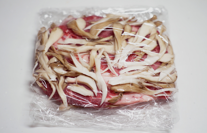 ①冷蔵庫からステーキ肉を取り出し、まいたけは別の容器に移す。