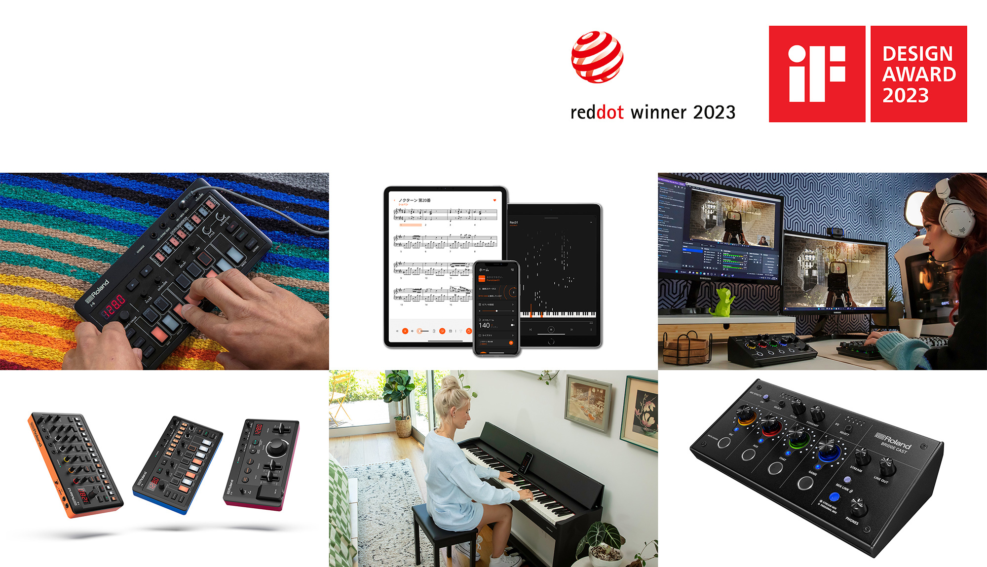 ローランド株式会社の小型電子楽器『AIRA Compact』シリーズの『T-8』、『J-6』、『E-4』 、デジタルピアノ『F107』と対応するアプリ『Roland Piano App』、ゲーミング・オーディオ・ミキサー『BRIDGE CAST』が揃って、国際的なデザイン賞である「iFデザイン賞 2023」と、「レッドドット・デザイン賞 2023」をダブル受賞しました。