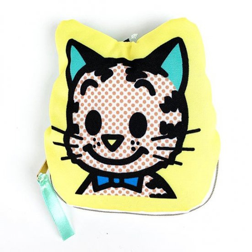 マスコットのようなかわいさが魅力の、ダイカットのポーチです。イエローカラーにキャットのデザインで、ふわふわな厚みのある素材感もキュートです。ファスナーにはアップルグリーンのサテンリボンもついていて、アクセントに♡