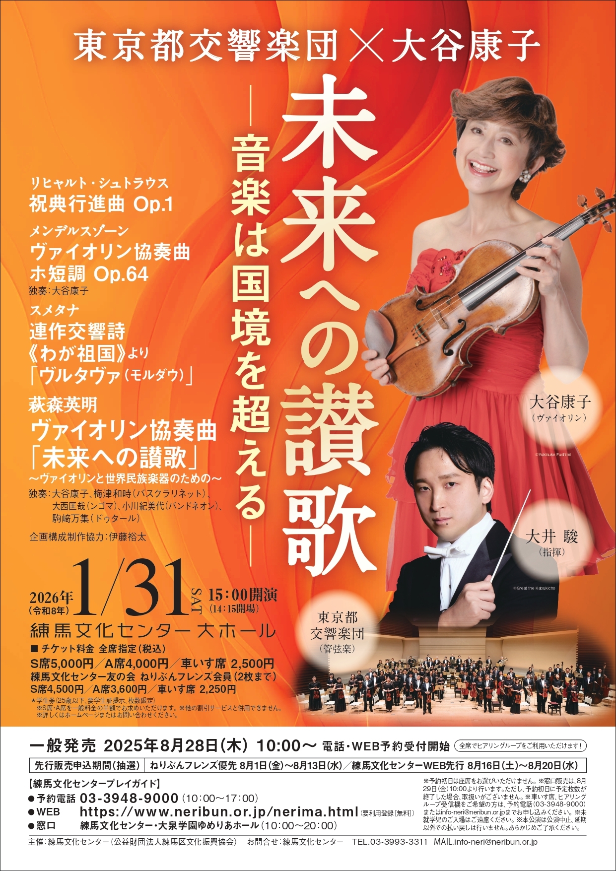 練馬文化センター(公益財団法人練馬区文化振興協会)は、2026年1月31日(土)に「東京都交響楽団×大谷康子 未来への讃歌―音楽は国境を超える―」を開催いたします。
