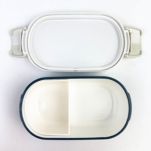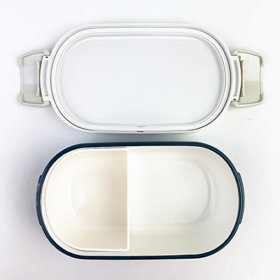 長方形ですが角は丸みがあって、かわいらしいフォルム♪ホワイト×ネイビーのバイカラーで、とってもシンプルなお弁当箱です。
