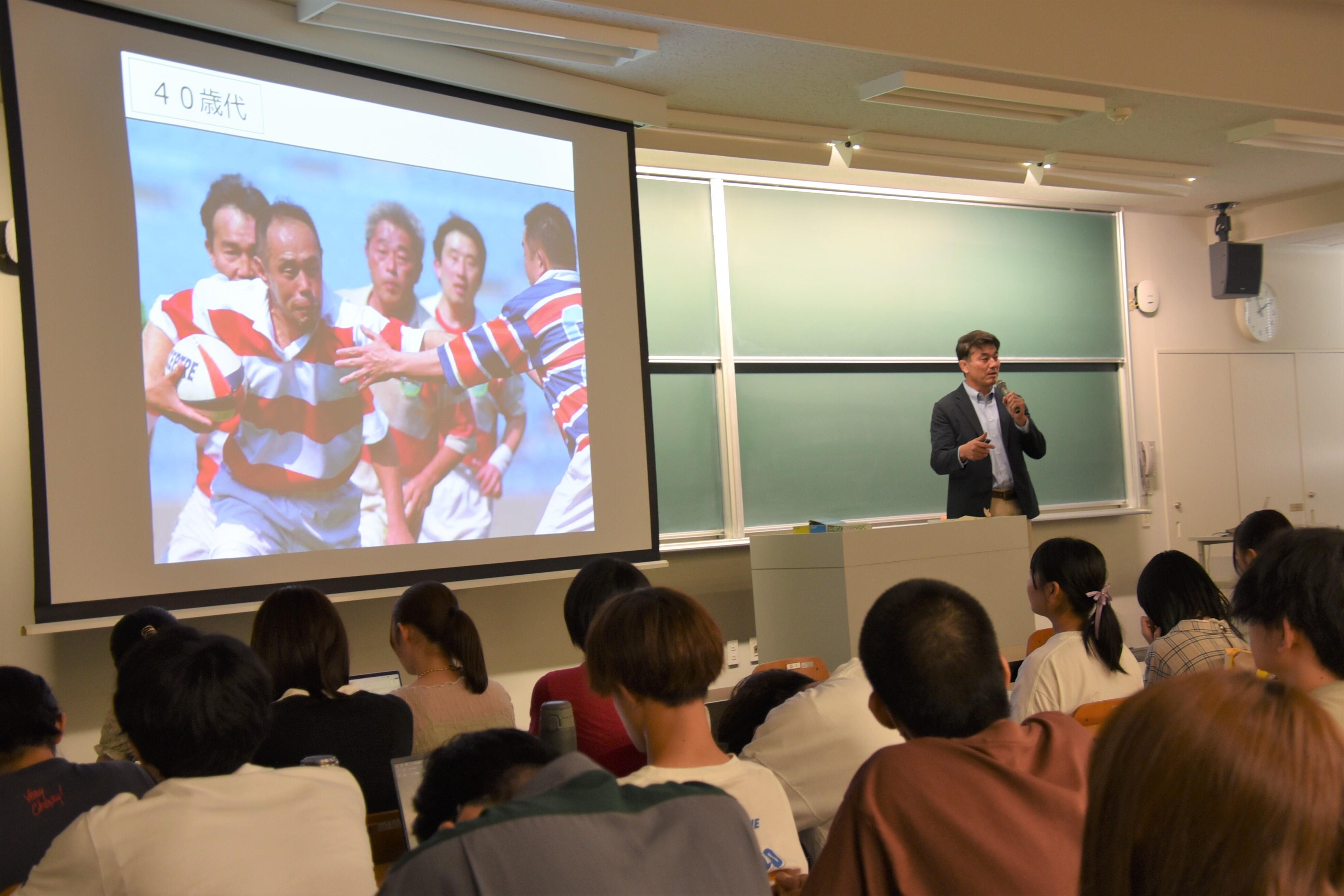 ラグビーの元日本代表で本学経済学部の小泉和也准教授が7月12日、八事キャンパスで行われた梅田孝教授が担当する薬学部の1年次開講科目「健康・スポーツ科学理論」の講義で登壇し、「Sports for all 国際スポーツ大会の意義と価値」と題して2コマ合わせて学生約280人に、ラグビーのワールドカップやオリンピックなど世界レベルのスポーツ大会の開催意義や中高年への運動機会の提供の重要性などを解説しました。