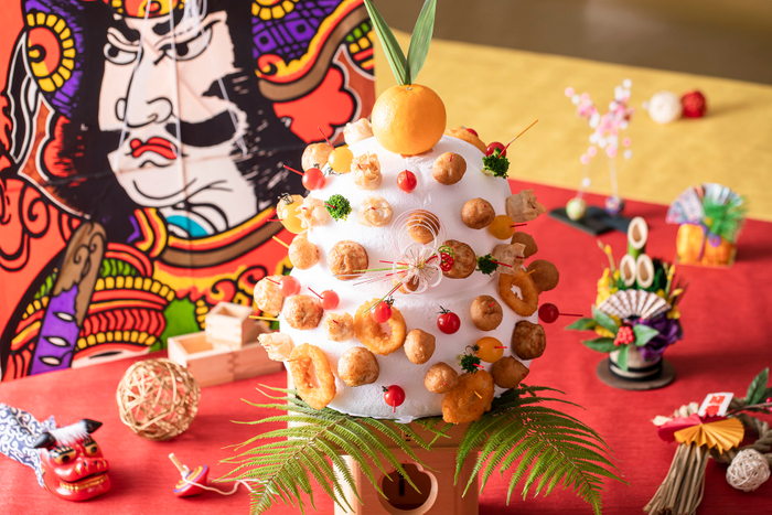 【温製】特製鏡餅(揚げたこ焼き / 飲茶 / アメリカンドッグ / イカリング / プチトマト) / 名古屋コーチン卵の茶わん蒸し ズワイ蟹の銀餡仕立て / 若鶏のパリパリ焼き 柴漬けとタスマニアマスタードのラヴィゴット / 白身魚のバプール 塩レモンと三重県産アオサのクリームソース / あらびきソーセージと大葉ジェノベーゼのショーソン / コーンたっぷりクリーミーなコロッケバーガー / 甘鯛の米粉揚げ 今市蕪と柚子のクーリー / とろとろに煮込んだ牛スジ肉と蓮根の土手煮 / 鶏の唐揚げと彩野菜のフリット 黒酢風味