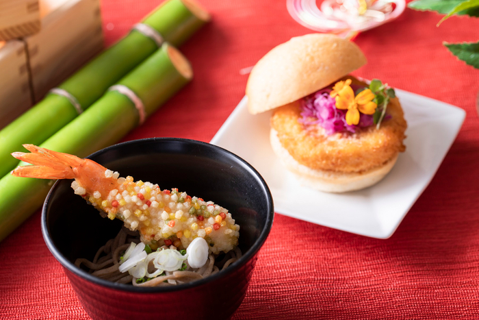 【温製】特製鏡餅(揚げたこ焼き / 飲茶 / アメリカンドッグ / イカリング / プチトマト) / 名古屋コーチン卵の茶わん蒸し ズワイ蟹の銀餡仕立て / 若鶏のパリパリ焼き 柴漬けとタスマニアマスタードのラヴィゴット / 白身魚のバプール 塩レモンと三重県産アオサのクリームソース / あらびきソーセージと大葉ジェノベーゼのショーソン / コーンたっぷりクリーミーなコロッケバーガー /