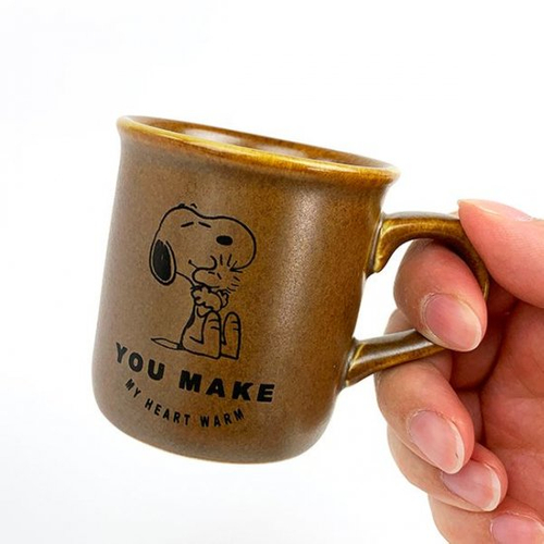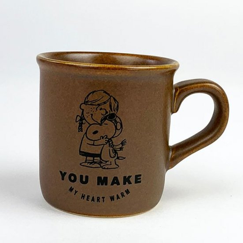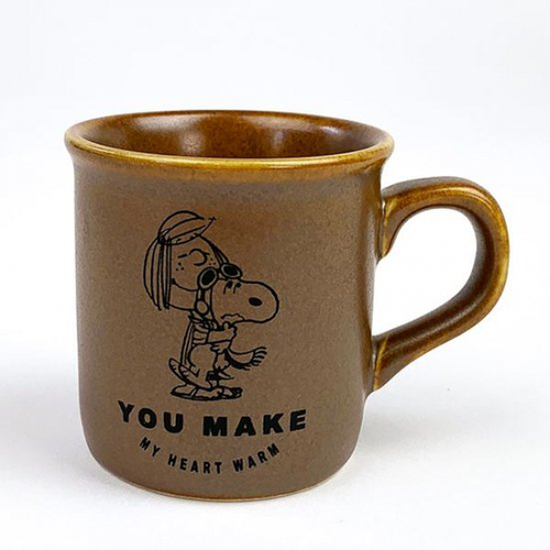 味わいのある飴色のカップに、スヌーピーがウッドストックをギュっとしているデザインがとってもかわいいマグカップです。