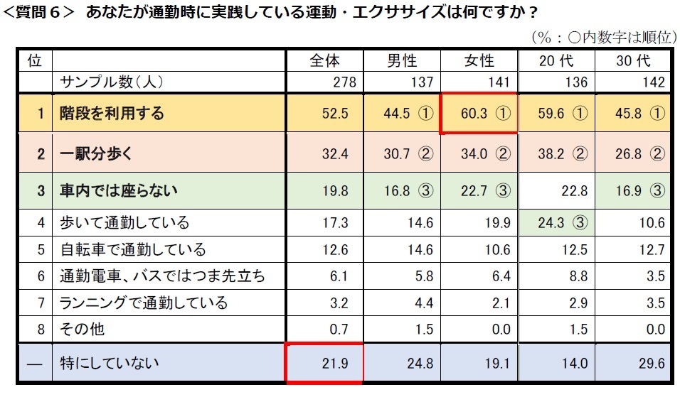 上位3項目は「階段を利用する」(52.5%)、「一駅分歩く」(32.4%)、「車内では座らない」(19.8%)でした。「階段を利用する」は過半数が回答しており、最も実践しやすい運動と言えます。また、「歩いて通勤している」(17.3%)、「自転車で通勤している」(12.6%)という人も少数ですがいます。