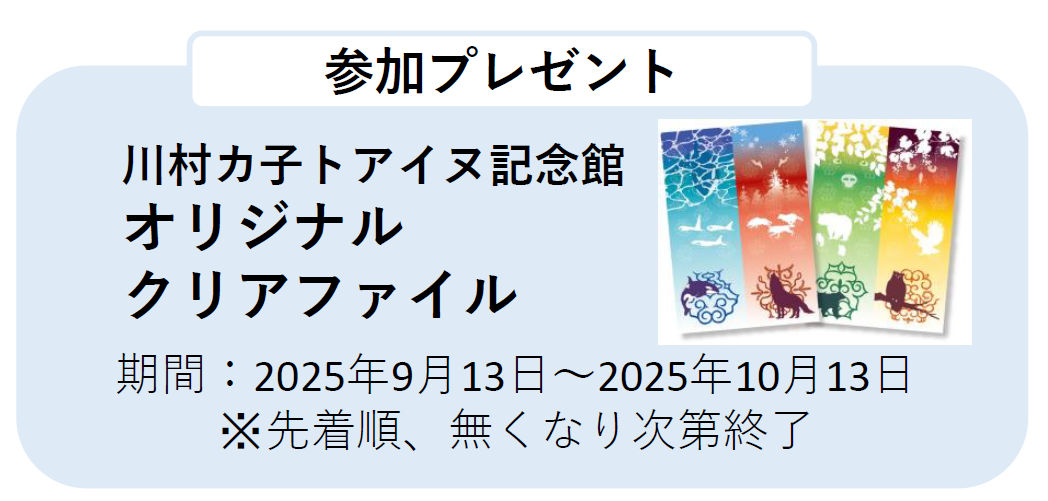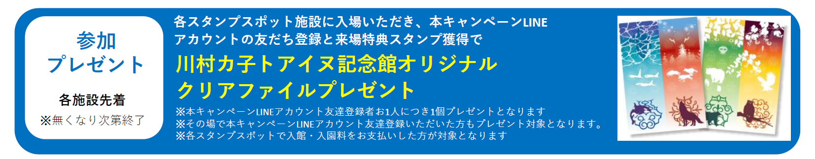 旭山動物園内のアイヌとゆかりのある動物の園舎を含めた計5カ所と、旭川市内アイヌ施設2カ所のスタンプスポットを巡るスタンプラリーを実施します。また、参加者特典として、先着で川村カ子トアイヌ記念館オリジナルクリアファイルをプレゼントいたします。