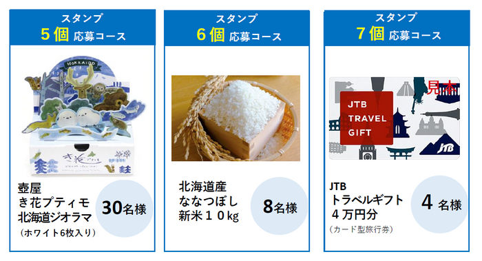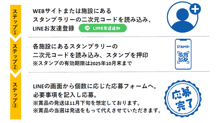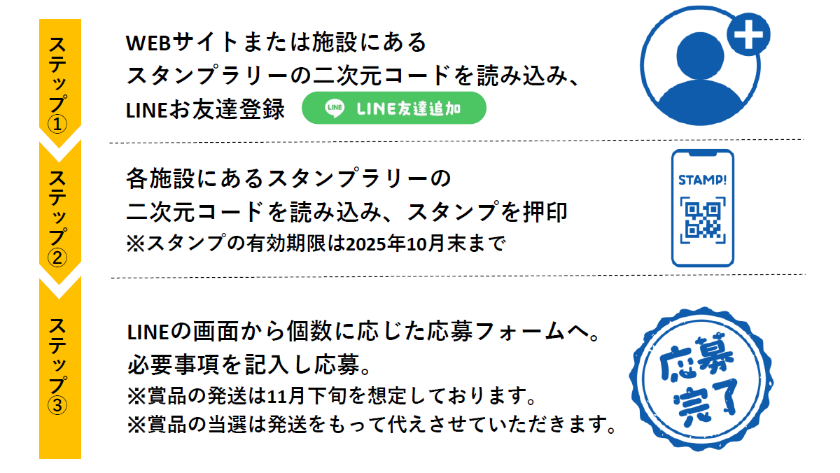 ・内容:2025年9月13日(土)~10月13日(月・祝)開催期間中、本キャンペーン公式LINEアカウントを友だち登録いただき、対象スポットを巡って、スタンプを集めます。集めたスタンプの個数に応じた3つのコースに応募すると、抽選で素敵な賞品が当たります。