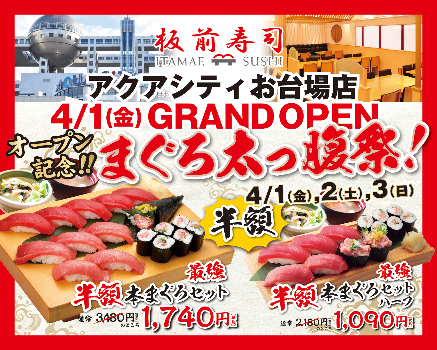 4月1、2、3日の3日間、まぐろ太っ腹祭!を開催。やま幸のまぐろを使用した人気No.1商品“最強本まぐろセット”を半額でお楽しみいただけます。※アクアシティお台場店限定のイベントです。