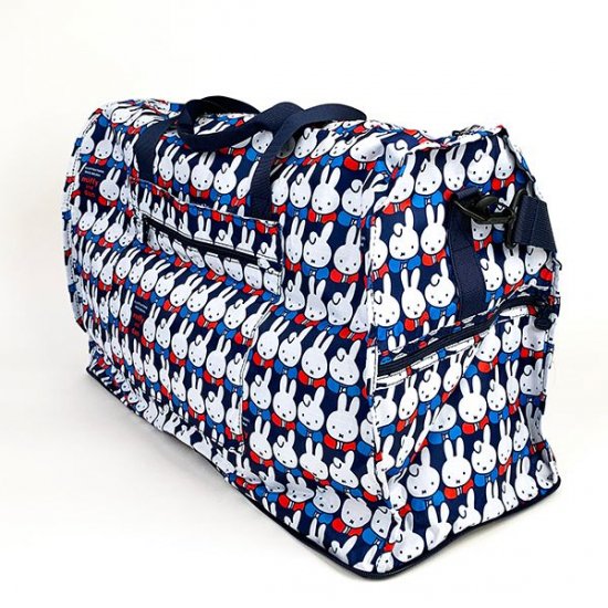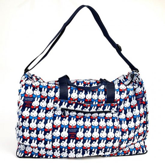 ミッフィー&ダーンのチラシ柄がかわいいボストンバッグ。持ち手のほかに着脱可能なショルダーもついているので、2WAYで使っていただけます。