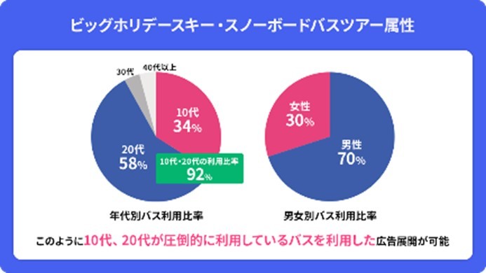 ビッグホリデー株式会社(本社:東京都文京区、代表取締役社長:岩崎 安利)は、スキー&スノーボードバス利用客を対象としたサンプリング配布サービス、サンプリング使用後のアンケート集計、スキー&スノーボードバスをラッピングするプランの販売を開始しました。スキー・スノーボードバス利用客の、10代、20代比率が92%と圧倒的に高く、リーチしやすいのが特徴です。