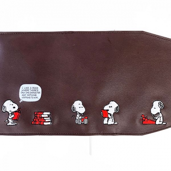 ブラウンカラーに読書をするスヌーピーが刺繍されています。チュコレートのようなこっくりとした深みのあるブラウンは、高級感もありますよね。