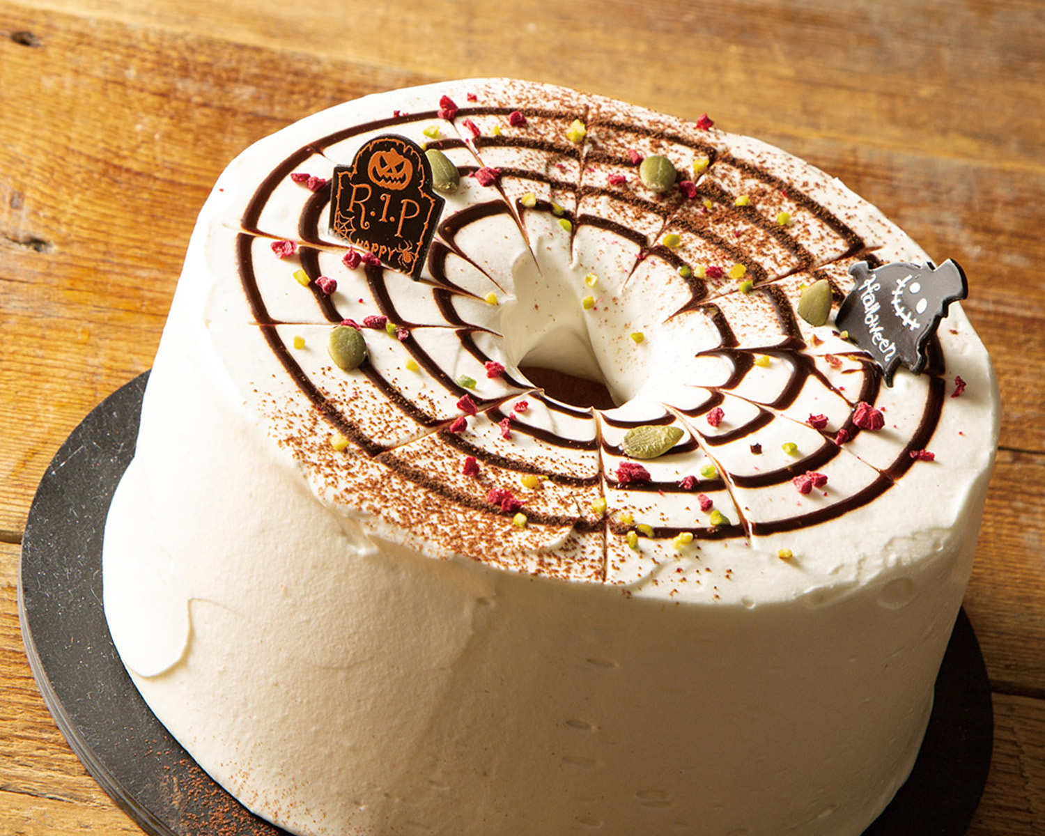 しっとりふわふわ食感に仕上げたシフォンケーキの上には、たっぷりの北海道産生クリームとかぼちゃの種、ハロウィン仕様にクモの巣をあしらいました。目にも楽しい、ハロウィン気分を高めてくれるスイーツをお楽しみいただけます。