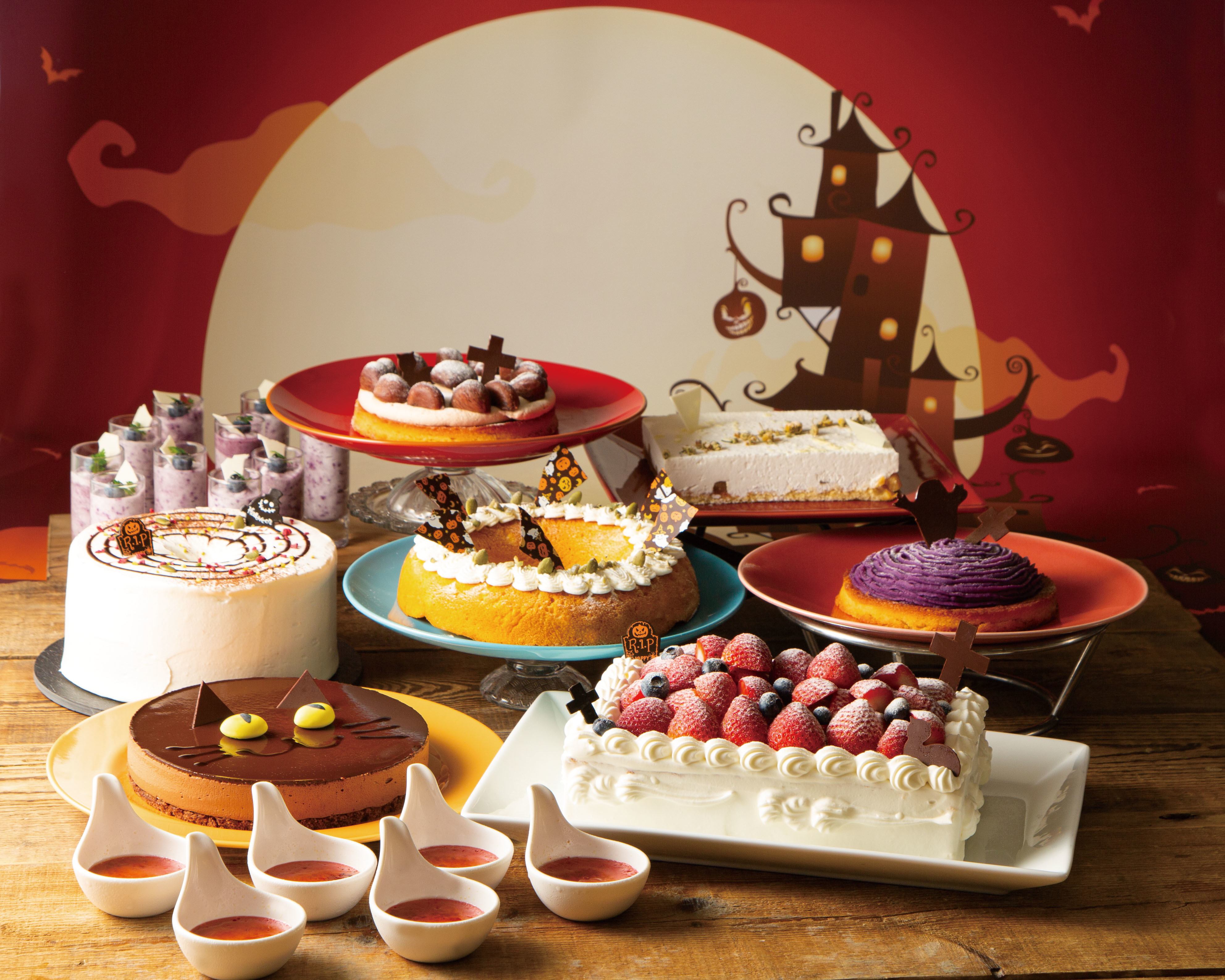 Salon de Sweetsがお届けする今年のハロウィンフェアは、十字架型などのチョコレートを添え、ハロウィンらしいムードを演出した看板メニュー“いちごのショートケーキ”のほか、クモの巣をあしらった目にも楽しい“かぼちゃのシフォン”や、ハロウィンのシンボルのひとつ、黒猫に見立てた“チョコレートムースケーキ”など、全9種類をビュッフェスタイルでお楽しみいただけます。