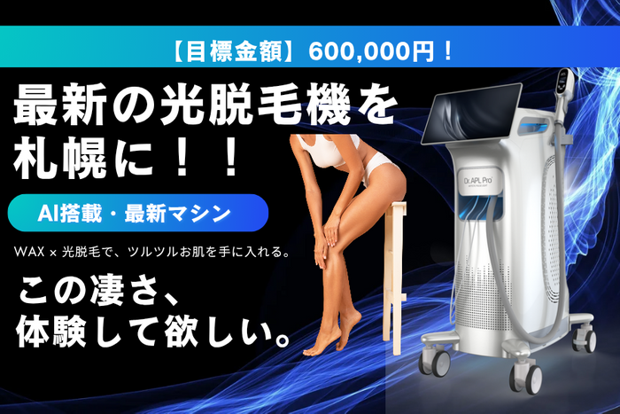 Relua〜Relax & radiance〜(所在地:北海道札幌市中央区南六条西11丁目エクリュ402号室、代表:菅野)は、タイ古式・ワックス脱毛サロン「Relua(レルア)」で、導入が実現すれば、北海道内2台目となる革新的なAIスキンアナライザー搭載脱毛機「Dr.APL Pro」の導入を目指し、クラウドファンディングサイト「CAMPFIRE」にて2026年2月26日までプロジェクトを実施しています。目標金額は60万円で、AI技術による肌分析と自動最適化により「効果が高い」施術と「即効性と持続性」を兼ね備えた次世代の脱毛体験の提供を目指します。