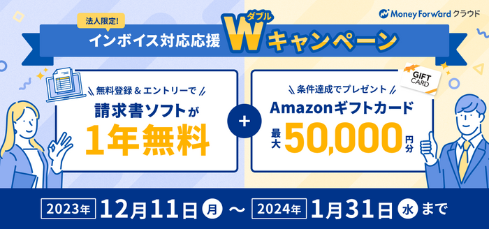 株式会社マネーフォワードは、インボイス制度に対応する中小企業に向けて、「インボイス対応応援Wキャンペーン」を、2023年12月11日より開始します。本キャンペーンは、期間中に『マネーフォワード クラウド』に申し込んだ法人に対し、『マネーフォワード クラウド請求書』を1年間無料で提供します。さらに、支給条件を満たした法人には、最大5万円のAmazonギフトカードをプレゼントします。