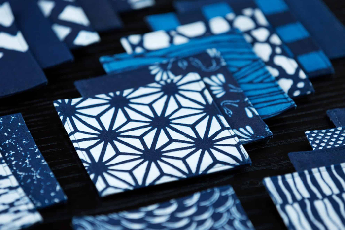 工房に併設されているギャラリーには、小沼氏が手がけた作品が並びます。市松模様や麻の葉模様など、老舗紺屋ならではの古典模様から、小沼氏自らがあみ出したオリジナルのものまで、約6000種類の模様を駆使して多彩な作品が生み出されています。作品を見るだけでも楽しめますが、模様に込められた縁起担ぎの意味合いや当時の文化を作り手から教わることで、より黒羽藍染の奥深さを知ることができます。また、型紙を使わない、小沼氏オリジナルのモダンな模様や、マスクやスニーカーなど現代の生活にも取り入れやすい作品も見どころです。