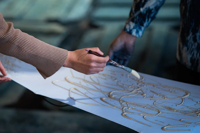 工房では、小沼氏から黒羽藍染の特徴や歴史の説明を受けた後、自由な図柄表現ができる創作染め「フリ」の体験を行います。「フリ」とは、型染めで使用する糊を液状にし、筆や刷毛で思いのまま自由に描く、小沼氏が編み出した創作染めです。偶発的なしずくや線が入り混じり、世界に1つだけの模様が描けます。ご自身がデザインした手ぬぐいは小沼氏が染め、後日ご自宅に郵送します。