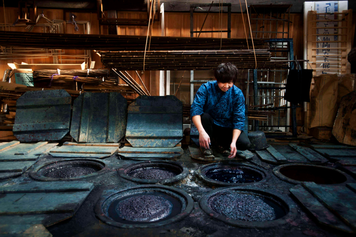 1985年、栃木県大田原市生まれ。高校卒業後、江戸川区指定無形文化財・長板中形(ながいたちゅうがた)(*5)の技術保持者、松原 與七(よしち)氏に師事。24歳の時に家業を継ぎ、1804年創業の「黒羽藍染紺屋」の八代目となる。現在では黒羽藍染技術と藍染めの甕(かめ)を引き継ぐただ一人の職人。手がける多くの作品は「型染め」と呼ばれる、いくつもの工程を要する伝統技法によるもの。デザインから型紙制作、染め上げまで、手や指先が頼りの手仕事で、小沼氏の手は一年中藍に染まっています。