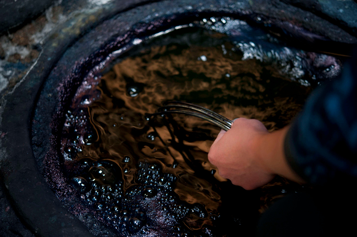 栃木県伝統工芸品に指定されている藍染。初代、紺屋新兵衛(*2)が舟運が盛んだった野州黒羽の地(現在の大田原市黒羽地区)に藍甕を埋め込み、材木商の印半纏(しるしばんてん)(*3)を染めていたのがその始まりです。豆汁(ごじる)(*4)に松の根を燃やして作る良質なすす(松煙墨(しょうえんずみ))を混ぜて、下染めする技法を用いており、藍の色合いが濃く、色褪せにくくなるのが特徴的です。