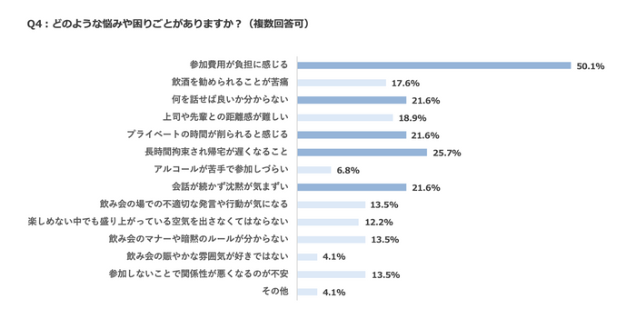 主な悩みとしては「参加費用が負担に感じる(50.1%)」「長時間拘束され帰宅が遅くなること(25.7%)」「プライベートの時間が削られると感じる(21.6%)」「何を話せば良いか分からない(21.6%)」「会話が続かず気まずい(21.6%)」などが挙げられ、賛成派も反対派と共通する悩みを抱えていることが分かりました(Q4)。