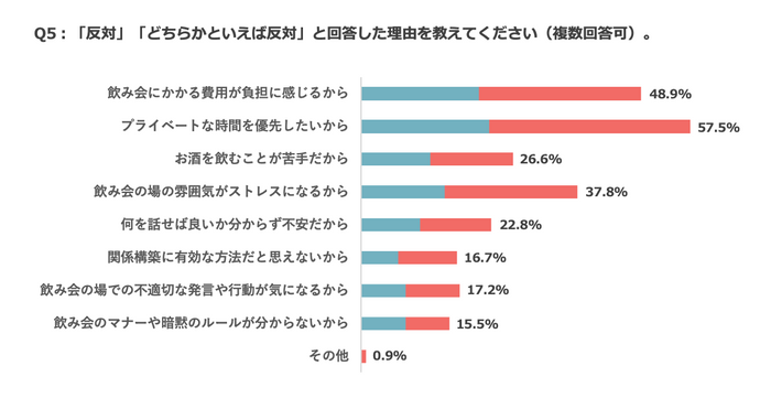反対派の理由としては、「プライベートな時間を優先したいから(57.5%)」「飲み会にかかる費用が負担に感じるから(48.9%)」「飲み会の場の雰囲気がストレスになるから(37.8%)」などが大きな比率を占めました(Q5)。