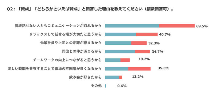 賛成派の理由としては、「普段話せない人ともコミュニケーションが取れるから(69.5%)」「リラックスして話せる場が大切だと思うから(40.7%)」「楽しい時間を共有することで職場の雰囲気が良くなるから(35.3%)」などが大きな比率を占めました(Q2)。