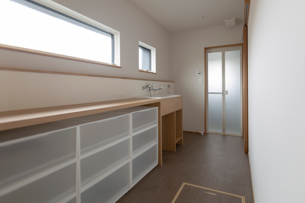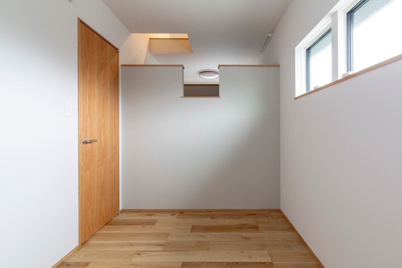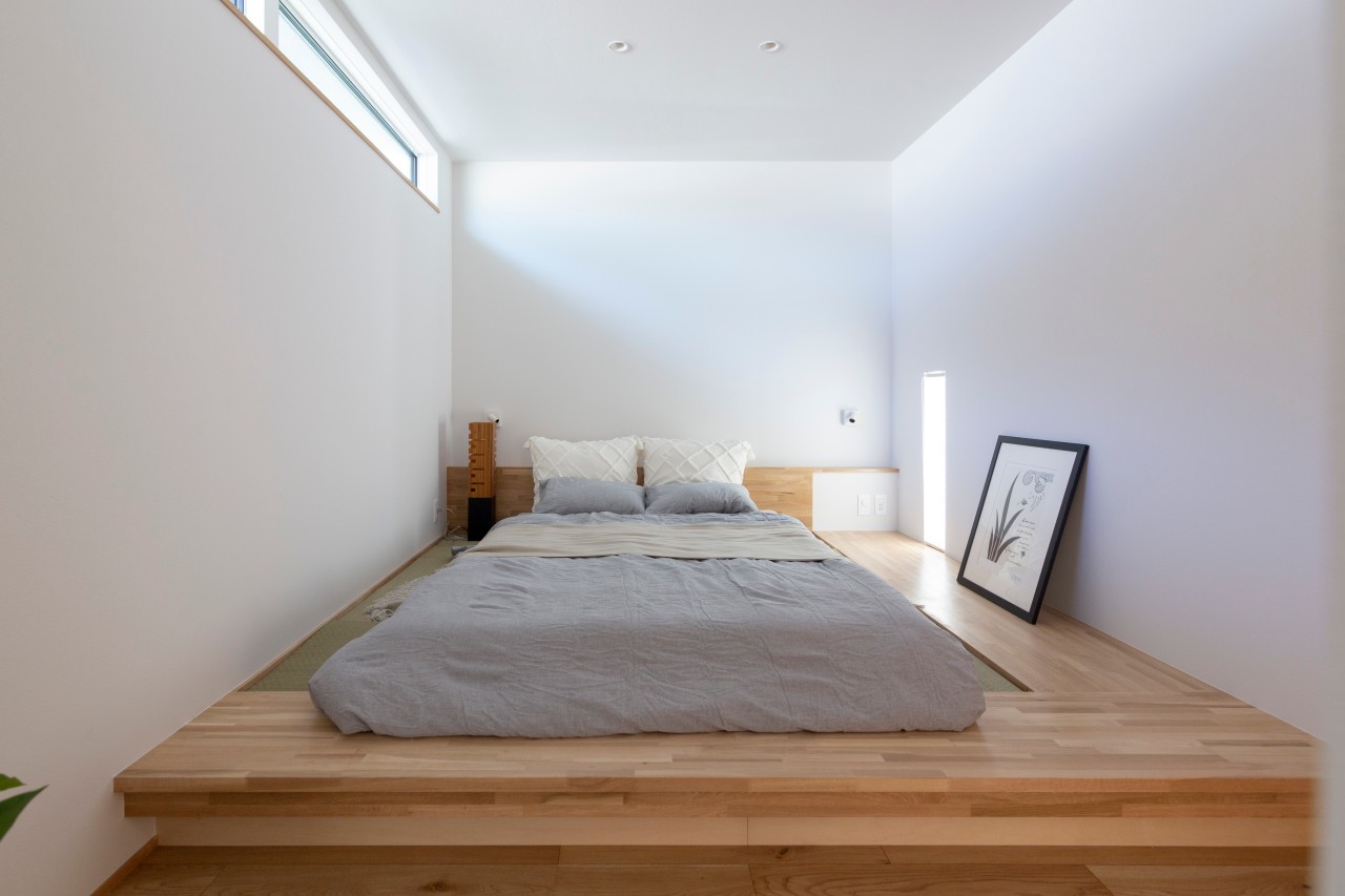 主寝室の小上がりベッドは、畳にすることで和室としての活用も可能。隣接するウォークインクローゼットを通り繋がる脱衣室は、「衣類の家事を一か所で完結させたい。」というママ目線のアイデア盛り込んだ、造作の家事スペースを配置しました。