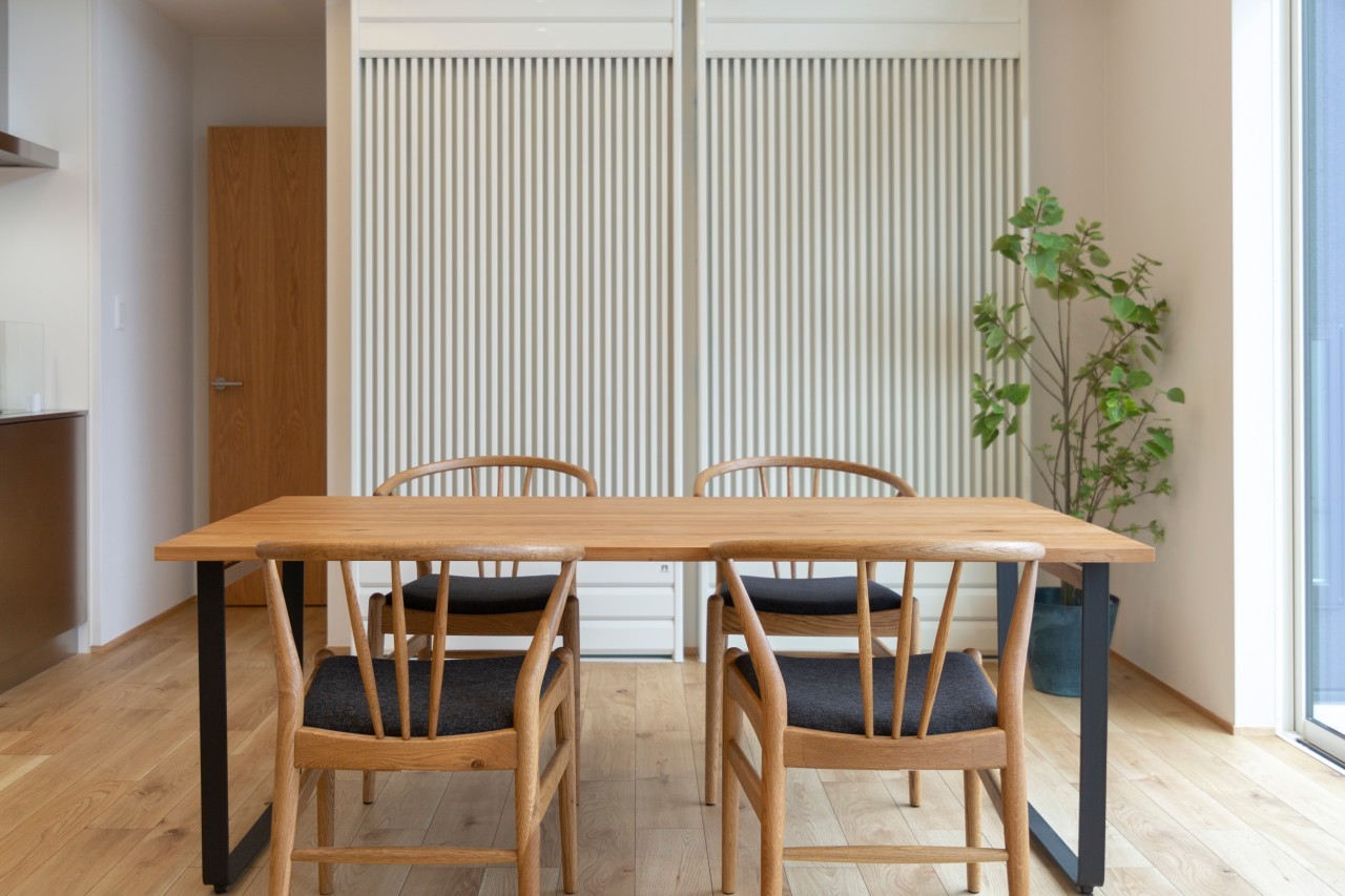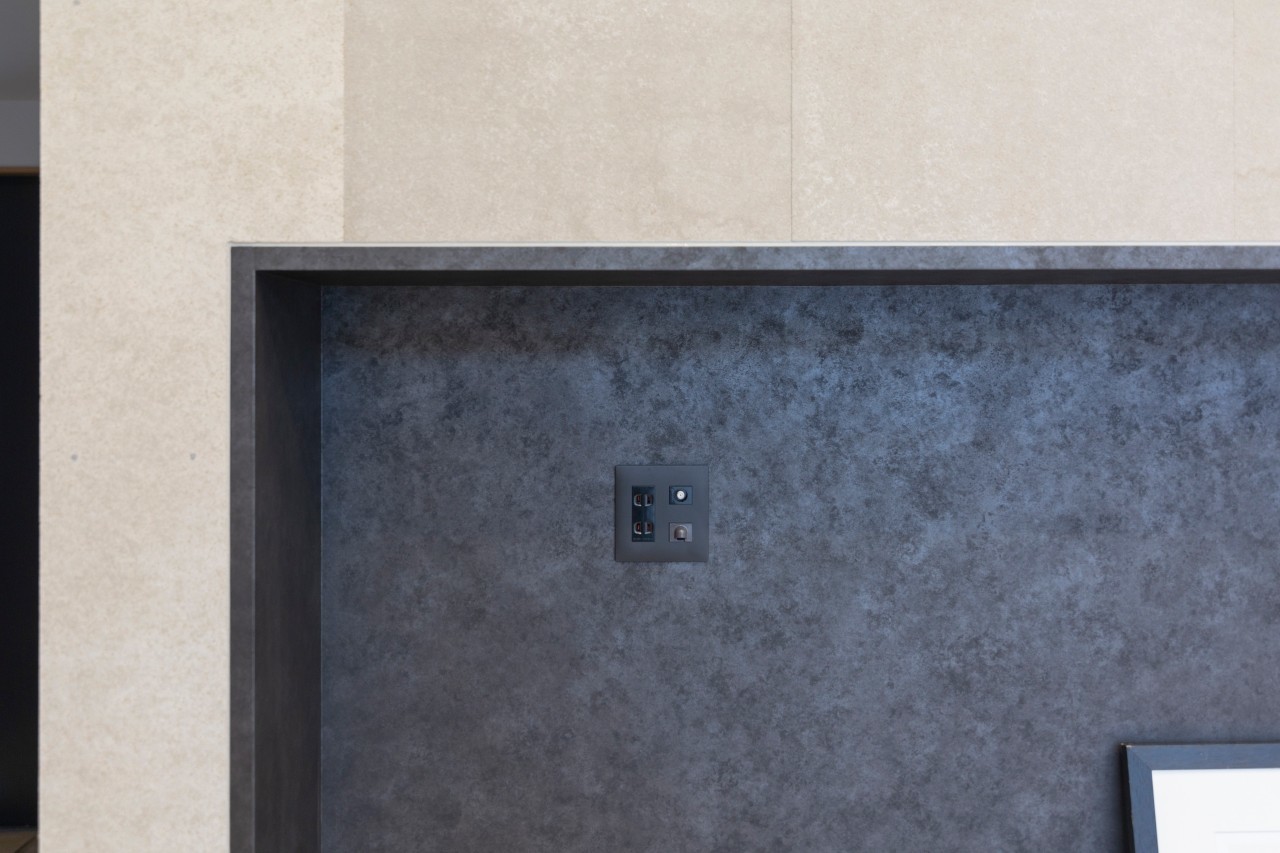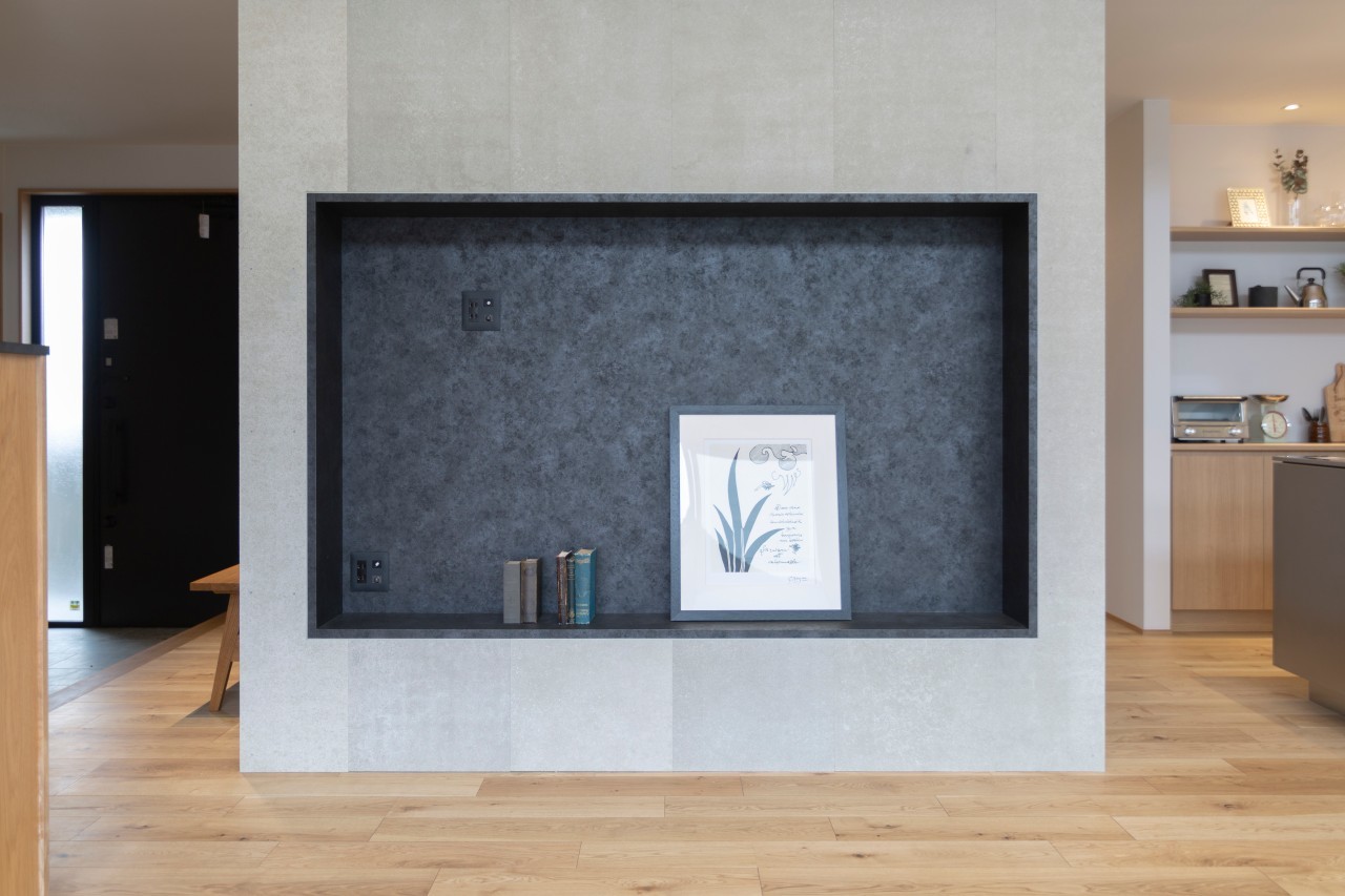 玄関を入ると広がる、約21畳のLDKには造作のソファーを配置。隣接するテレビボードはセメントの質感を生かし、一枚として同じものが無い素材「SOLIDO」( https://www.kmew.co.jp/shouhin/solido/ )を採用。ナチュラルな木目をベースとした空間に程よいアクセントを加えます。