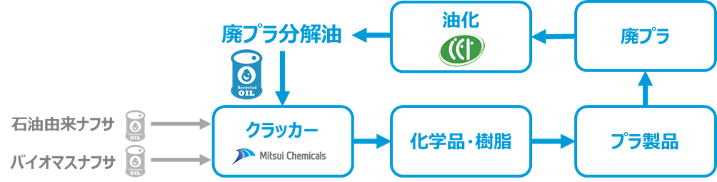 三井化学株式会社(本社:東京都中央区、代表取締役社長:橋本 修、以下「当社」)は、サーキュラーエコノミーの実現に向けて、株式会社CFP(本社:広島県福山市、代表取締役社長:福田奈美絵、以下「CFP」)より調達した廃プラスチックを原料とした熱分解油(以下、廃プラ分解油)を、2024年3月に当社大阪工場(大阪府高石市)のクラッカーへ投入し、マスバランス方式によるケミカルリサイクル由来の誘導品(化学品・プラスチック)の製造・販売を開始しました。