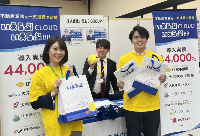 いえらぶのブースでは、いえらぶ君Tシャツを着た社員が商談対応。スタンドバナーに掲出した「いえらぶCLOUD」「いえらぶBB」の導入実績に足を止める方や、ノベルティに興味を持って受け取ってくださる方など、さまざまな形で多くの来場者にブースにお越しいただきました。