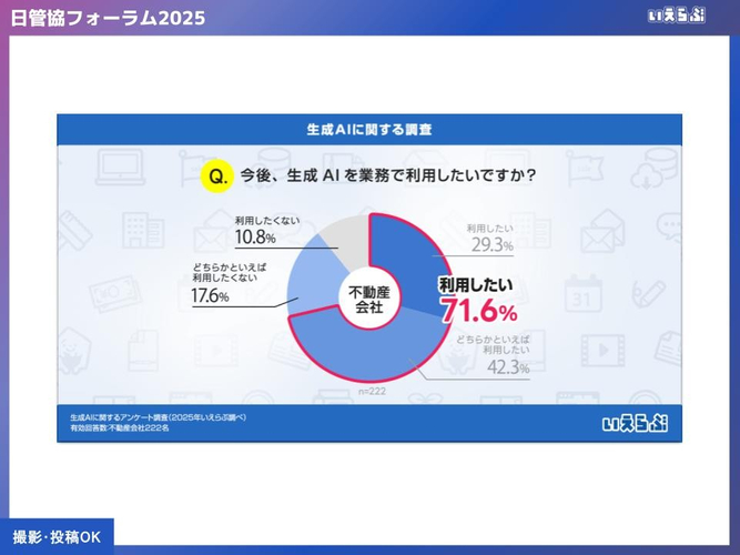 いえらぶが不動産会社を対象に実施した「生成AIに関するアンケート調査」では、「今後、生成AIを業務で利用したいですか?」という質問に対し、「利用したい」と答えた方が71.6%となりました。多くの方が業務の効率化に関心を持っており、AIをどのように活用していくか、日々模索している状況だと言えます。