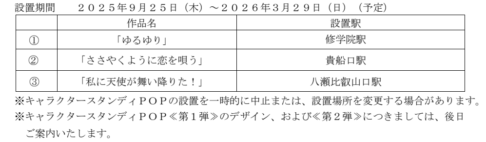 各作品のイラストを使用したキャラクタースタンディPOPを設置します。叡山電車の沿線を巡りながら、キャラクタースタンディPOP巡りをお楽しみください。