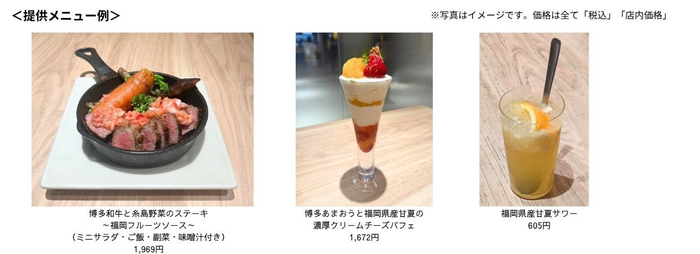 フェアでは、福岡県のブランド和牛「博多和牛」や「博多あまおう」、貯蔵でしっかりと熟成され酸味がやわらいだ甘夏など福岡県産食材を使用した期間限定の定食・スイーツメニューを提供します。