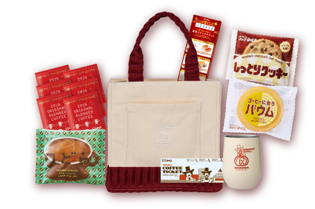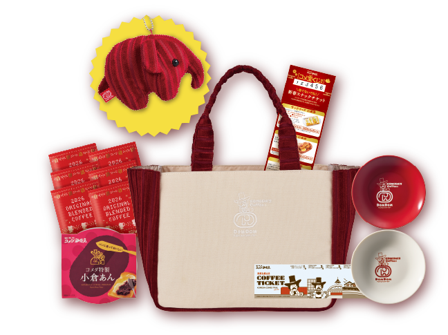 さらに、ここでしか手に入らないドムドムハンバーガーとのコラボ商品も!コメダ珈琲店のソファー柄生地を使用した「どむぞうくんキーホルダー」や、コメダのくつろぎナビゲーター「コメダンディ」と「どむぞうくん」が一緒に描かれたイラスト入りのプレートやステンレスタンブラーなど、日常使いしやすいアイテムをご用意しました。加えて、福袋オリジナルデザインのドリップコーヒーや、コーヒーチケット、スナックチケットもセットに。各店舗数量限定につき、なくなり次第予約および販売を終了します。この機会を、ぜひお見逃しなく!