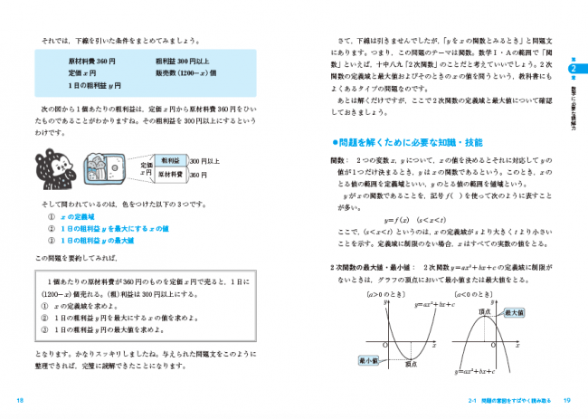 ここでは、数学Ⅰ・A の全分野についての基礎知識を「解答に必要な知識・技能」としてまとめてあり、問題の「解説」もわかりやすく、考え方をていねいに示しています。