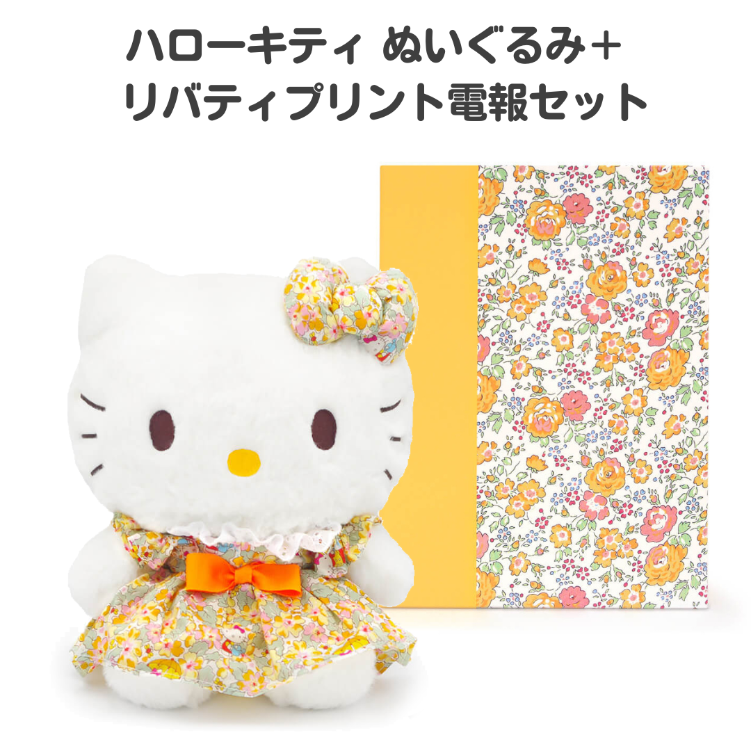 リバティ生地がお揃いのぬいぐるみと電報を合わせて、少し大人っぽい雰囲気に。