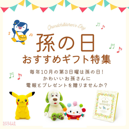エクスメールでは、心を込めたメッセージが伝わる電報と、気持ちに寄り添うギフトを多数ご用意。全国どこでも送料無料で、孫の日当日(10月19日)のお届けにも対応しています。