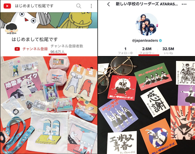 Tiktokフォロワー数260万人の「新しい学校のリーダーズ」や、食品のCMでおなじみ「はじめまして松尾です」など。今旬なクリエイターグッズに出会えます。